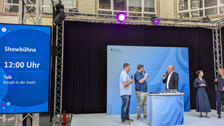 In einem offenen Bühnentalk berichteten Kolleginnen und Kollegen von den Amtsgerichten aus Brandenburg und der Justizverwaltung persönlich und nahbar aus ihrem Arbeitsalltag: von verantwortungsvollen Entscheidungen im Grundbuch- und Nachlasswesen bis hin zu Zwangsversteigerungen und Betreuungen. Dabei wurde deutlich, wie vielseitig und unverzichtbar unsere Arbeit für die Funktionsfähigkeit der Justiz ist. Das Publikum konnte Fragen stellen und erlebte die Justiz aus erster Hand – nicht als trockene Paragrafen, sondern als Berufsfeld voller Verantwortung, Vielfalt und Chancen.